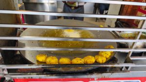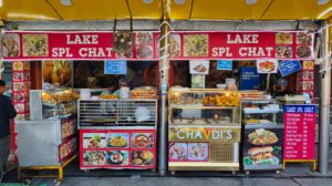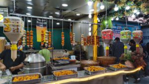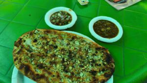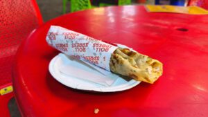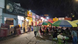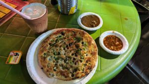 Als die Dunkelheit einsetzte, suchte ich mir ein Restaurant und stieß auf einen kleinen Platz mit Sitzgelegenheiten, der von vielen verschiedenen kleinen Restaurants umgeben war. Ich bestellte mir ein Matar Kulcha, ein mit Kichererbsen gefülltes Fladenbrot. Dazu gab es eine Zwiebelsoße und ein Schälchen mit Chana, einem Kichererbseneintopf. Das Brot war super lecker, der Eintopf ein wenig zu scharf. Da ich noch nicht ganz satt war, bestellte ich mir bei einem anderen Laden noch eine Chicken Tikka Malai Roll. Auch sehr lecker.