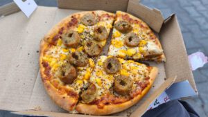 Und da das etwas wenige war, holte ich mir gegenüber  noch eine kleine Pizza. Das war vielleicht keine so gute Idee, da es mittlerweile schon 17:00 Uhr war und ich im Hotel noch meinen Luftfilter ausbauen wollte. Den muss ich dann nämlich noch gründlich reinigen und dann über Nacht trocknen lassen, bevor ich ihn dann morgen einölen kann.