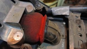 Zurück im Hotel war es schon dunkel und ich musste meine Stirnlampe anziehen um vernünftig arbeiten zu können. Ich nahm die Sitzbank ab und entfernte den Luftfilter vom Ansaugrohr. Er war schon ziemlich schmutzig. In Ermangelung an Spülmittel, gab ich etwas Duschgel in den Eimer mit warmem Wasser und wusch den Filter gründlich aus.