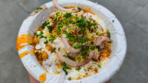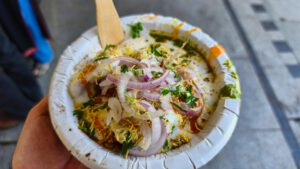 Als ich fertig war fragte ich den Mann auf der Bank neben mir, was er denn essen würde. Tikki Chole, etwas mit Kichererbsen. Das wollte ich dann auch noch probieren. Es war genau das gleiche nur zusätzlich mit einer Kelle Kichererbseneintopf. Dadurch noch etwas leckerer.