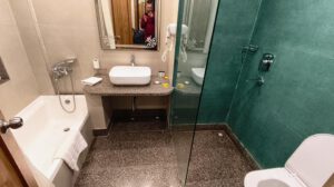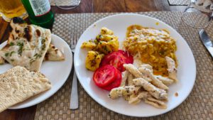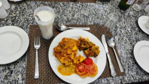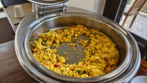 Als ich um 6:15 Uhr in den Frühstücksraum kam, waren die anderen schon fertig. Ich nahm mir schnell ein wenig Obst und bekam ein frisches Masala Omelette auf Toast.
