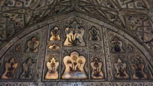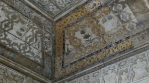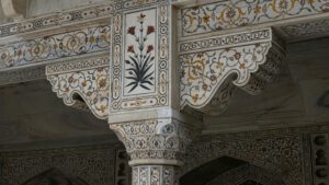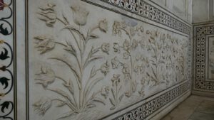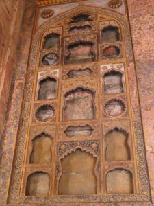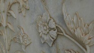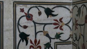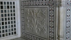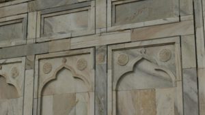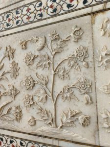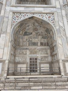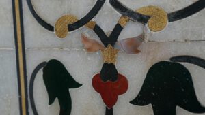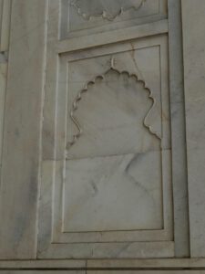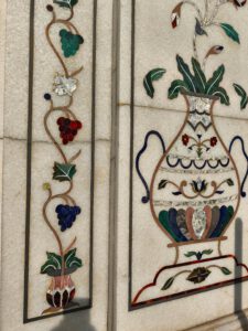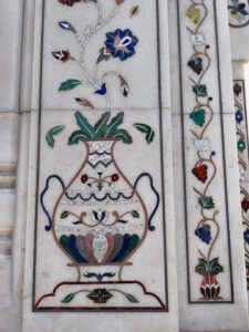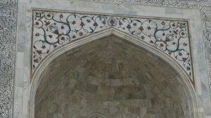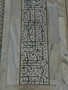 Die Inschrift um die Torbögen herum sind Verse aus dem Koran. Sie sind nicht auf den Marmor aufgemalt, sondern es handelt sich um Intarsien aus schwarzem Jaspis. Auch die Blumenmuster sind Einlegearbeiten aus verschiedenen farbigen Halbedelsteinen.