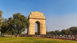 Jetzt fuhren wir nochmal zum Präsidentenpalast, an den wir allerdings erneut nicht sonderlich nah heranfahren konnten, da die Polizei die Straße gesperrt hatte. Doch am India Gate konnten wir diesmal Halt machen und uns für eine halbe Stunde die Beine vertreten. Inkl. der obligatorischen Fotos.