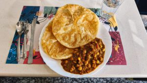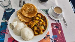 Der Tag begann mit einem guten Frühstück. Ich hatte 2 Portionen Chole Bhature, das vielleicht beste bisher, und ein Omelette. Anschließend noch etwas Obst.