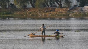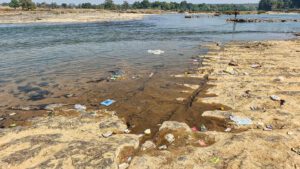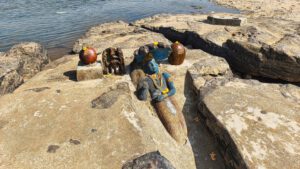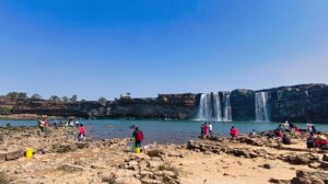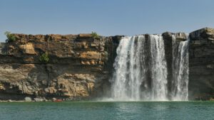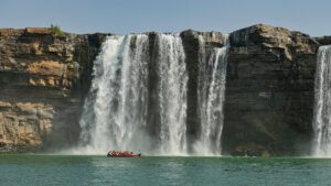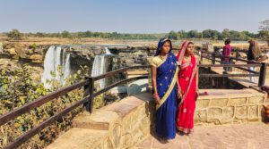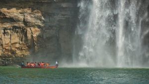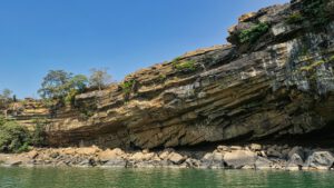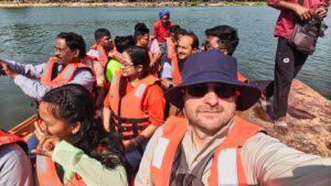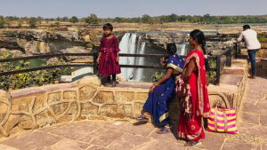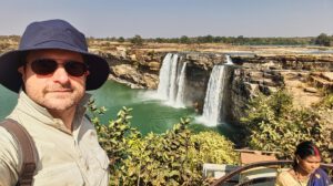 Am Ende des Rundweges bog ich zum Flussufer ab und machte für nahezu unerschwingliche 50 Rupien (0,47€) eine Bootsfahrt zum Wasserfall. Ich fand die Gesteinsschichten, die im unteren Teil weggespült waren und somit oben überhingen, noch beeindruckender als den Wasserfall selbst. An den sind wir dann auch so dicht rangefahren, dass meine linke Seite einiges an Spritzwasser abbekommen hat. Deshalb setzte ich mich nach der Fahrt noch ein paar Minuten auf einen Stein am Flussufer, beobachtete das wuselige Treiben am Bootsanleger und wartete bis die Sonne meine Sachen getrocknet hatte. Währenddessen schrieb ich auch diese Zeilen meines Tagebuchs. Es ist immer praktisch, wenn ich zwischenzeitlich ein paar Zeilen schreibe, so dass ich mich nicht am Abend im Hotel an den ganzen Tag zurück erinnern muss.