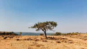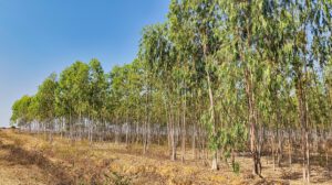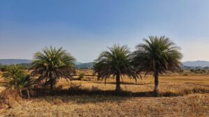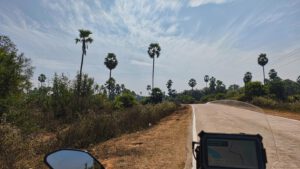 Zwischen den vertrockneten Reisfeldern stehen immer mal wieder vereinzelte Palmen und kleine Eukalyptusplantagen. Eine tolle Strecke zum Motorradfahren.