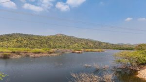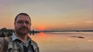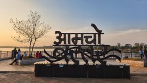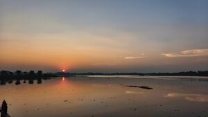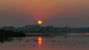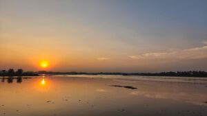 Als ich zurück nach Jagdalpur kam, war es immer noch hell und ich hatte noch 40 Minuten bis zum Sonnenuntergang. Also fuhr ich doch noch zu dem Aussichtspunkt am See und wartete darauf, dass die Sonne über dem See unterging, so dass ich ein paar kitschige Fotos vom Sonnenuntergang machen konnte.