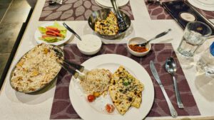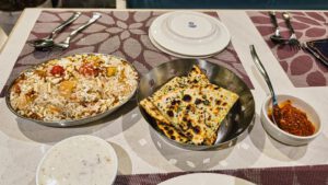 Am Abends gönnte ich mir nochmal ein Abendessen im Hotel. Das Restaurant lag auf dem Dach und war sehr schön gemacht, allerdings bei 14 Grad Außentemperatur recht kühl. Ich hatte ein Kashmiri Pulao (Reis mit Früchten), da mir der Kellner wegen der Schärfe von einem Biryani abriet, sowie ein Paneer Kulcha Brot. Beides lecker, doch leider recht schnell kalt.