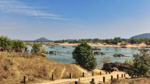 Zuerst schaute ich mir den Wasserfall von oben an. Da der Fluss jetzt in der Trockenzeit nur wenig Wasser führte, erstreckte sich der Wasserfall nur über etwa ⅓ der Klippe. Im Internet hatte ich Bilder gesehen, wo er deutlich breiter war. Aber egal, schön war er trotzdem. Von der Art her erinnerte er mich ein wenig an die Iguacu-Fälle in Südamerika. Nur um ein Vielfaches kleiner und ohne Regenwald. Er ist vom Charakter her eben deutlich breiter als hoch. Anders als z. B. die kleinen Wasserfälle im Hochgebirge Nepals.