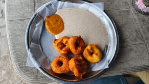 Einen Ort weiter hielt ich an um zu Frühstücken. Es war leider bei weitem nicht so gut wie die letzten beiden Frühstücke im Hotel. Es gab ein paar frittierte Donuts mit einem Kokosnuss Chutney. Etwas später hielt ich dann noch einmal und probierte ein paar Mini-Samosas, die mit Gemüse statt KArtoffeln und Kichererbsen gefüllt waren. Auch sehr lecker.