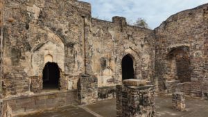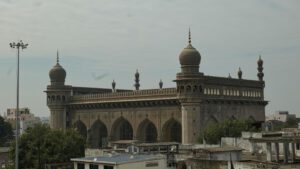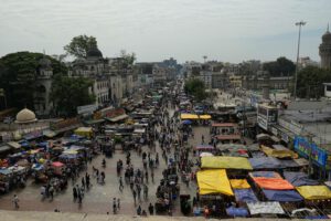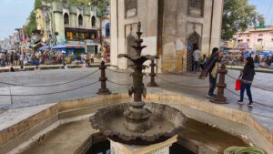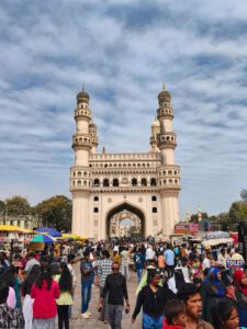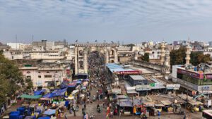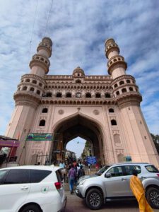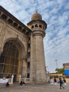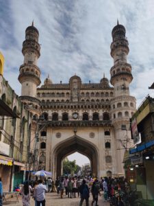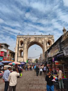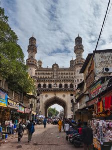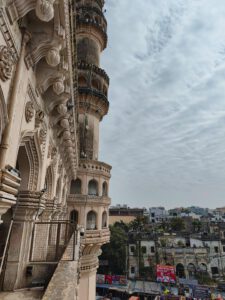 Nun nahm ich mir ein Uber in die Altstadt und besichtige das Charminar, das Wahrzeichen von Hyderabad. Es markierte damals den Mittelpunkt der Stadt und im Obergeschoss befindet sich eine Moschee, die man allerdings nicht besichtigen kann. Die erste Etage kann man aber über enge Treppen in den Türmen erreichen. Von dort hatte ich einen tollen Ausblick über den Basar.