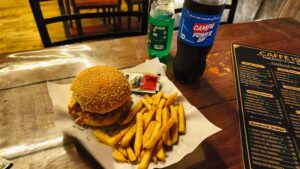 Dann ging ich hinunter zum Meer und spazierte den Strand entlang bis mich der Hunger überkam. Heute war mir mal wieder nach Fast Food und ich ging in einen Burger-Laden in dem es laut Google Maps auch Shawarma hätte geben sollen. Das gab es leider nicht, doch sie hatten einen Chicken Wrap. Ich hoffte, das wäre so etwas ähnliches und bestellte es zusammen mit einem Chicken Burger mit Fritten. Dazu bekam ich ein extrem synthetisch schmeckendes Apfelgetränk.
