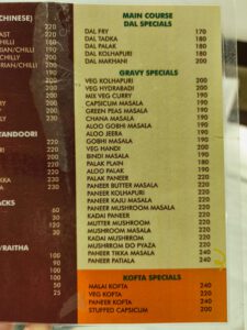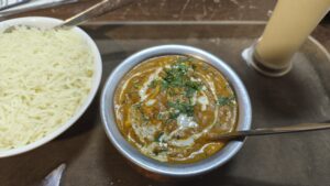 Am Abend ging ich wieder ins Hotel-Restaurant essen und bestellte diesmal ein Dal Makhani mit Cheese Naan und Lassi. Für zusammen 380 Rupien.