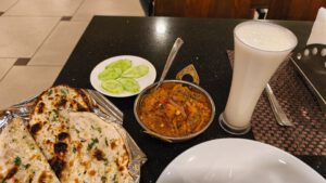 Zum Abendessen bestellte ich mir ein Lassi und etwas Cheese Naan. Ich hatte nicht viel Hunger.