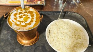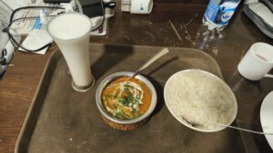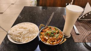 Zum Abendessen hatte ich Paneer Masala mit Reis und Lassi.