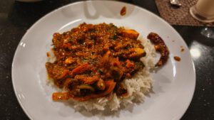 Am Ausgang nahm ich ein Tuk Tuk zurück zu meinem Hotel wo ich sofort zu Abend aß. Ein Kadai Paneer, mit extra Pilzen und Reis. Super lecker.