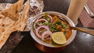 Um 19:00 Uhr raffte ich mich auf und ging ins Restaurant etwas Essen. Heute gab es Chana Masala mit Cheese Naan. Etwa scharf, aber lecker.