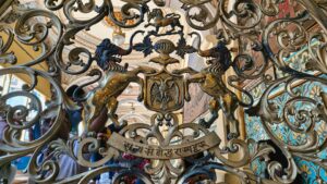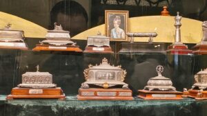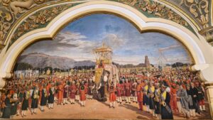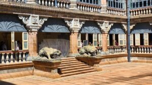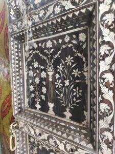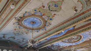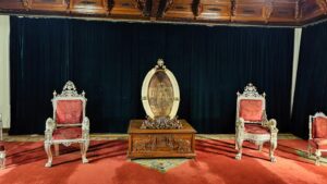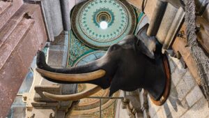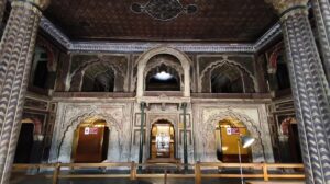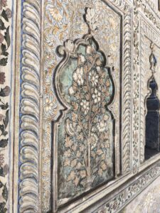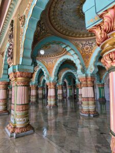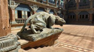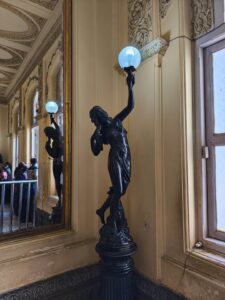 Der Palast selbst war nicht so schön wie die Paläste in Rajasthan, die wir auf der Rundreise besichtigt hatten. Doch die etwas andere Architektur war schon interessant. Die Säulen waren aus Metall und wurden in Glasgow, Schottland gefertigt. Einige der Fliesen kamen aus England und Italien, Spiegel aus Belgien und 2 Lampenskulpturen ebenfalls aus Italien.