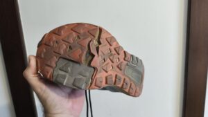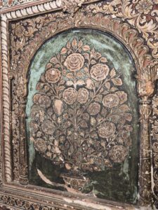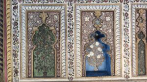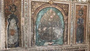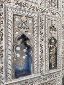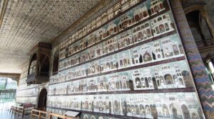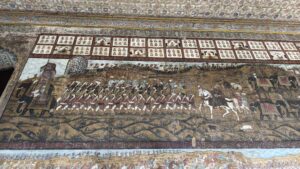 Hier waren die Wände aus verputzten Backsteinmauern, die allerdings komplett bemalt waren. Außen einige große Gemälde von Prozession und Schlachten. Innen eher Verzierungen.