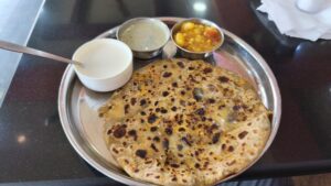 Als ich ankam, ging ich erst mal etwas essen. Es gab leider kein Masala Dosa, also nahm ich ein Paneer Paratha. Zusammen mit Quark, einem Chutney und ein paar Kartoffeln war es ein schönes Mittagessen. Die Paratha war gut gefüllt und sehr lecker. Eine der besten, die ich bisher in Indien hatte, obwohl es eigentlich ein nordindisches Gericht ist.