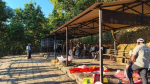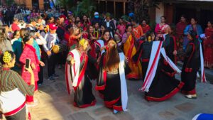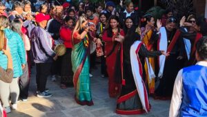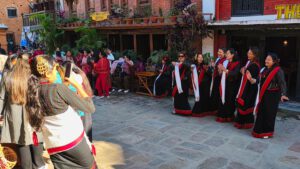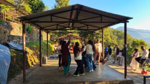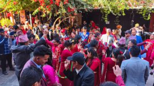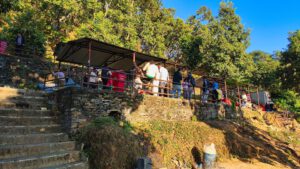 Von etwas oberhalb des Tempels hörte ich traditionelle nepalesische Musik. Neugierig stieg ich die Stufen hinauf und fand eine ausgelassene Meute auf einem Picknickplatz.