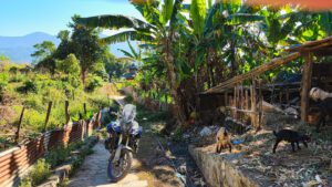 In Bandipur angekommen stellte ich mein Motorrad auf einem Parkplatz am Ortsrand ab, da das Zentrum des Ortes für Fahrzeuge gesperrt ist.