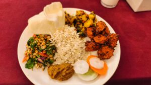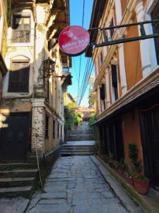 Abendessen gab es im Restaurant „The Samay Baji“. Ich bestellte das gleichnamige traditionelle Newari-Gericht Samay Baji und als Vorspeise ein Sandheko, eine Art Hühnchensalat. Super lecker.