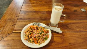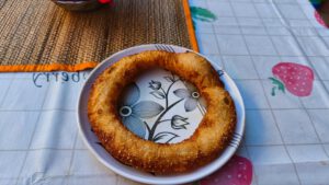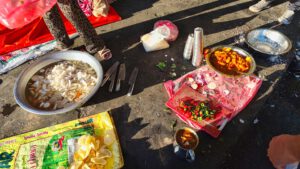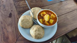 Zum Frühstücken ging ich in das gleiche Restaurant wie gestern, wo ich auf den Google Maps Bildern ein interessantes Frühstücksgericht gesehen hatte. Es stand zwar nicht auf der Karte, doch ich konnte es trotzdem bestellen. Die Dame meinte es heißt „Bhakacha Mari“. Es muss wohl ein sehr spezielles Gericht oder zumindest eine sehr lokaler Name dafür sein, denn eine Google Suche brachte nichts zu Tage. Egal. Es war sehr lecker.