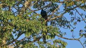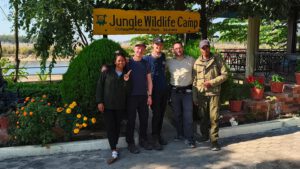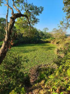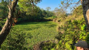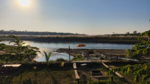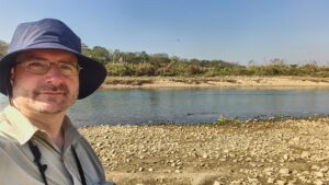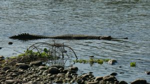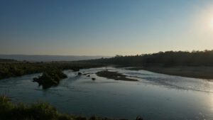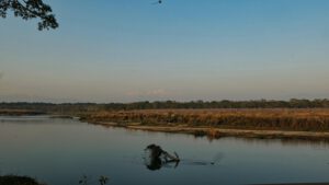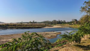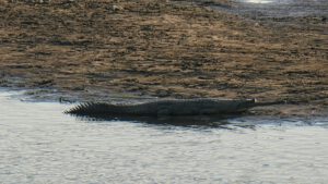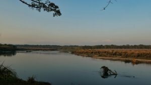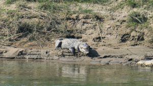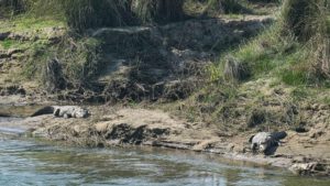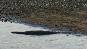 Nach dem Frühstück lieh ich mir ein Fernglas aus und ging am Flussufer spazieren. Die Ruhe hier ist einfach himmlisch. Ich sah ein paar kleinere Vögel und ein Entenpaar. Außerdem lag auf meiner Seite des Flusses ein Gavial in der Sonne. Ich traute mich bis auf geschätzte 20 Meter an ihn heran. Auch wenn Gaviale ausschließlich Fisch essen, wollte ich dann doch nicht noch näher gehen, schon allein um ihn nicht zu verscheuchen. Das war schon ein ziemlich außergewöhnliches Erlebnis.