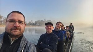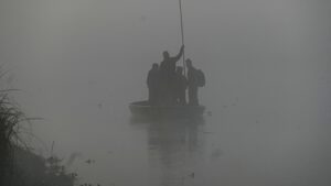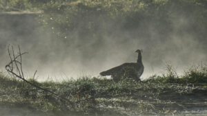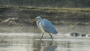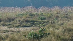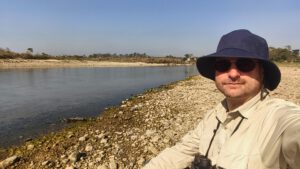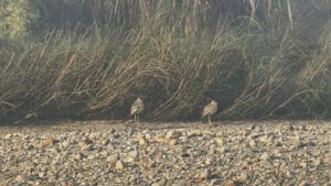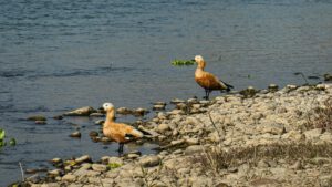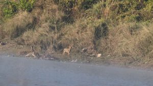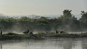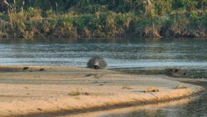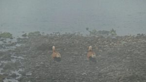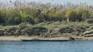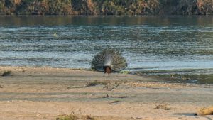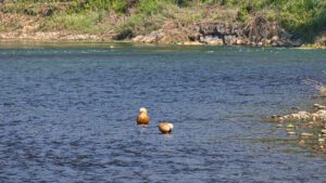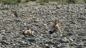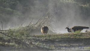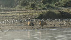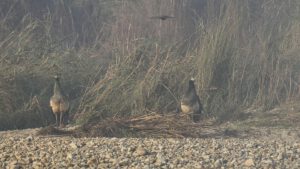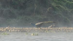 Außerdem verzog sich der Nebel in der Zeit schon eine wenig und es lag nur noch ein dünner Schleier über dem Fluss, der für eine tolle Atmosphäre sorgte. Während der einstündigen Kanufahrt sahen wir einige Vögel, darunter Enten aus Sibirien, die hier in Nepal überwinternund auf deutsch witzigerweise als Gans bezeichnet werden – Rostgans (Ruddy shelduck). Außerdem 2 Krokodile im Fluss und ein paar Pfauen am Ufer. Mit Pfauen hatte ich hier überhaupt nicht gerechnet.