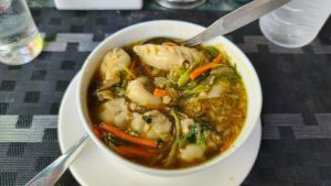 Um 11:30 Uhr waren wir zurück am Hotel und ich setzte mich zusammen mit den Jungs aus Holland ins Restaurant um eine Kleinigkeit zu essen. Ich hatte eine ausgesprochen leckere Momo-Gemüsesuppe.