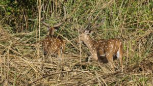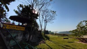 Kurz vor 14:00 Uhr erreichte ich das Jungle Wildlife Camo in Sauraha. Ich ließ mir 3 Zimmer zeigen. Das 3. hatte dann ein angenehm bequemes Bett und und sogar ein Badezimmer mit abgetrennter Dusche. Eine Seltenheit hier. Nachdem ich durchblicken ließ, dass ich mir noch ein günstigeres Hotel anschauen wollte, kam mir der Mann im Preis noch ein wenig entgegen. Am Ende sollte ich 3000 NPR (18€) für das Zimmer zahlen. Das war es mir wert, da das Resort direkt am Fluss liegt und angeblich manchmal sogar Nashörner hier zu sehen sind.