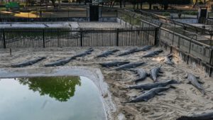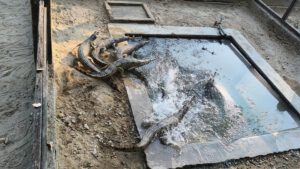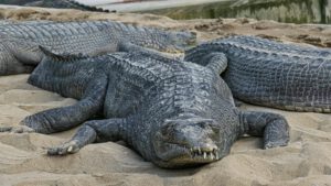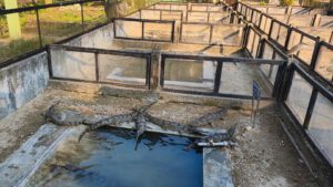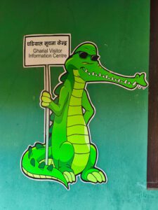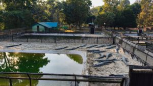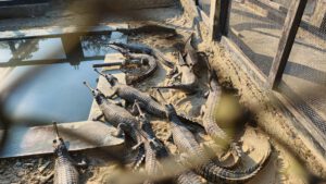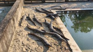 Gegen Ende der Safari besuchten wir noch die Krokodilaufzuchtstation, in der Gangesgaviale gezüchtet werden. Es gab verschiedene Becken für verschieden alte Krokodile. Sie werden nach 4½ bis 5 Jahren ausgewildert. In freier Wildbahn überleben aus einem Gelege lediglich rund 2% der Jungtiere. Die restlichen werden von Sumpfkrokodilen und Raubvögeln gefressen.