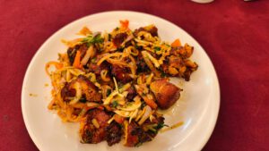 Ich brauchte eine halbe Stunde bis ich mich endlich für ein Restaurant entscheiden konnte und bestellte mir ein Chicken Sekuwa Sandheko als Vorspeise und ein Chicken Khaja Set als Hauptgericht. Dazu noch ein Garlic Naan und ein Lassi. Ich wollte der Nepalesischen Küche nochmal eine Chance geben. Das Essen ist bis jetzt das einzige was mir in Indien deutlich mehr zusagt als in Nepal. Aber es war wieder nicht so der Brüller.