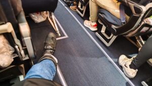 Dann kam die wirklich gute Überraschung. Im A330, in dem ich flog, bekam ich einen Sitz mit mehr Platz am Gang, da dort von 4 auf 3 Reihen in der Mitte umgestellt wurde. Zusätzlich blieb auch noch der mittlere Sitz leer, so dass ich angenehm viel Platz hatte und es mir mit den schweren Motorradstiefeln, die ich während des Fluges anziehen musste, ziemlich bequem machen konnte.