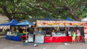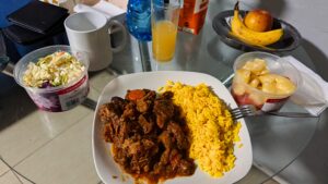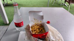 Anschließend ging ich nochmal in den Spar um Abendessen zu kaufen. Heute fiel mir auf, dass dort mitten im Markt gegrillt wurde. Ich nahm aber lieber ein Beef-Curry mit Reis, Salat und einer Schale Obstsalat, die allerdings nur aus Wassermelone und Ananas bestand.