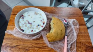 Ich wachte um 9:30 Uhr auf und machte mir wie gestern ein Müsli zum Frühstück. Dazu aß ich noch eine Banane und die Hälfte des halben Fruit Scone von gestern, das heute noch trockener war und das ich einfach nicht herunterbekam.