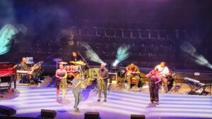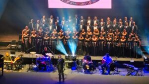 Erst um kurz nach 7 ging es dann los. Doch zuerst kam eine Vorgruppe mit 4 Sängern, die zusammen mit einer Band ein paar Lieder sangen, bei denen das Publikum den Chor machte und lautstark mitsang. Ich fand es total interessant, dass das Publikum mehrstimmig sang. Mindestens dreistimmig. Ob sie die Lieder im Kirchenchor lernten und dann jetzt entsprechend ihrer Stimme im Chor sangen?