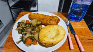 Auf dem Weg hielt ich nochmal bei dem Edelsupermarkt (Checkers) an und kaufte mir an der der Warmen Theke etwas zu Essen. Backfisch mit Gemüse und Kartoffeln, dazu noch ein Hühnchen-Pie.