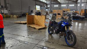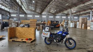 Am Depot traf ich Adrian, den Manager des Lagerhauses. Er gab mir eine Warnweste und führte mich zu meinem Motorrad. Bzw. wir suchten es. Zuerst dachte ich wir hätten es gefunden, da die Kiste meiner ziemlich ähnlich sah, doch bei genauerem Hinsehen fiel mir auf, dass es ein anderes Holz war und die Sockel auch kleiner waren.