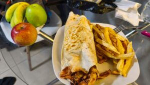 Da mir der Uber-Fahrer versicherte, dass die Gegend ich der ich wohnte doch relativ sicher sei und es kein Problem sei auch um 19:00 Uhr, wo es ja schon dunkel war, noch zum Supermarkt an der Ecke zu gehen, ging ich noch einkaufen. Ich brauchte dringend Wasser und wo ich schon mal da war kaufte ich auch noch Obst und Kekse. Neben dem Supermarkt gab es einen Shawarma Laden in dem ich mir eine großes Shawarma mit einer Portion Fritten bestellte. Die waren zwar nicht gut, weil total labberig, aber der Hunger trieb sie rein. Und das Shawarma war sehr lecker. Morgen werde ich mir aber wahrscheinlich wieder etwas von der warmen Theke im Supermarkt holen.