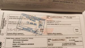 Er zeigte mir ein Foto von dem Aufkleber und ich zeigte ihm die Nummer im Carnet der Passages. Damit war er zufrieden. Und die Kiste musste er doch nicht aufbrechen, da jemand im Lager das passende Werkzeug hatte.