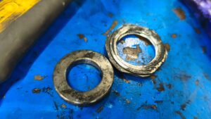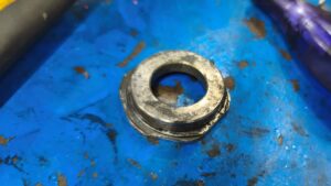 Dann kamen wir zum Hinterrad. Dort hatte ich ja seit ich in Indien angekommen war das Problem, dass die Werkstatt mit dem Abstandshalter den ich verloren hatte, improvisiert hatte. Jetzt habe ich zum ersten Mal gesehen, dass sie statt einem in der korrekten Größe einfach 2 eingesetzt hatten, die zusammen auf in etwa die korrekte Dicke kamen. Leider hatten sie in dieser Werkstatt das originale Teil nicht auf Lager, sonst hätte ich das korrigieren lassen. Ich muss mal schauen, ob ich das Teil in Johannesburg bestellen lassen kann, so dass es vorrätig ist, wenn ich ankomme. Das blöde ist nämlich, dass mit der improvisierten Lösung die Lagerdichtung nicht mehr gepasst hat, und die Werkstatt in Indien sie deshalb einfach weggelassen hat, was natürlich auf die Lebensdauer des Radlagers Einfluss hat.