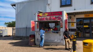 Ich entschied mich für ein kleines Schnellrestaurant in der Nähe wo es Bunny Chow gab. Ich bestellte es mit Kebab, was sich am Ende als Hackfleischbällchen herausstellte. Dabei handelt es sich um ein von Indern beeinflusstes Gericht, bei dem das Fleisch in einem kleinen Laib Brot mit scharfer Tomatensoße serviert wird. Leider war die Soße grenzwertig scharf. Gut, dass ich mich in Indien ein wenig an das scharfe Essen gewöhnt hatte, sonst hätte ich es nicht essen können. Ich hate nicht auf dem Schirm, dass das Essen in Südafrika so scharf wäre.