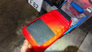 Zurück im Apartment schnitt ich mir zwei kleine Stücke aus der Matte heraus und klebte sie mit 2-Komponenten-Kleber auf die Unterseite des Benzinkanisters. So liegt er leicht gedämpft auf dem Koffer auf und klappert nicht mehr.