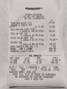 Anschließend ging ich noch in einen SPAR Supermarkt und kaufte mir Wasser und ein paar Sachen zum Frühstück für die nächsten Tage. Da ich einen Kühlschrank und ein wenig Geschirr in meinem Zimmer hatte, kaufte ich mir u. a. Milch und Müsli.